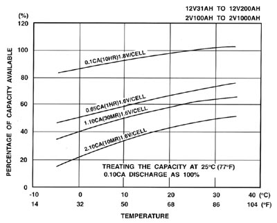 溫度對(duì)電池容量有顯著的影響,溫度降低,電池容量下降,請(qǐng)參考曲線圖。 |
